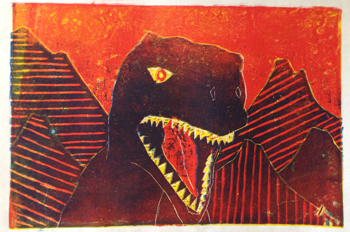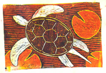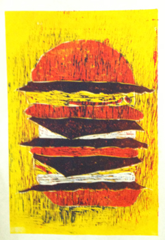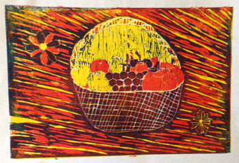 ○黄色→赤色→青色の順番で刷る(その度、版木は水洗いする)