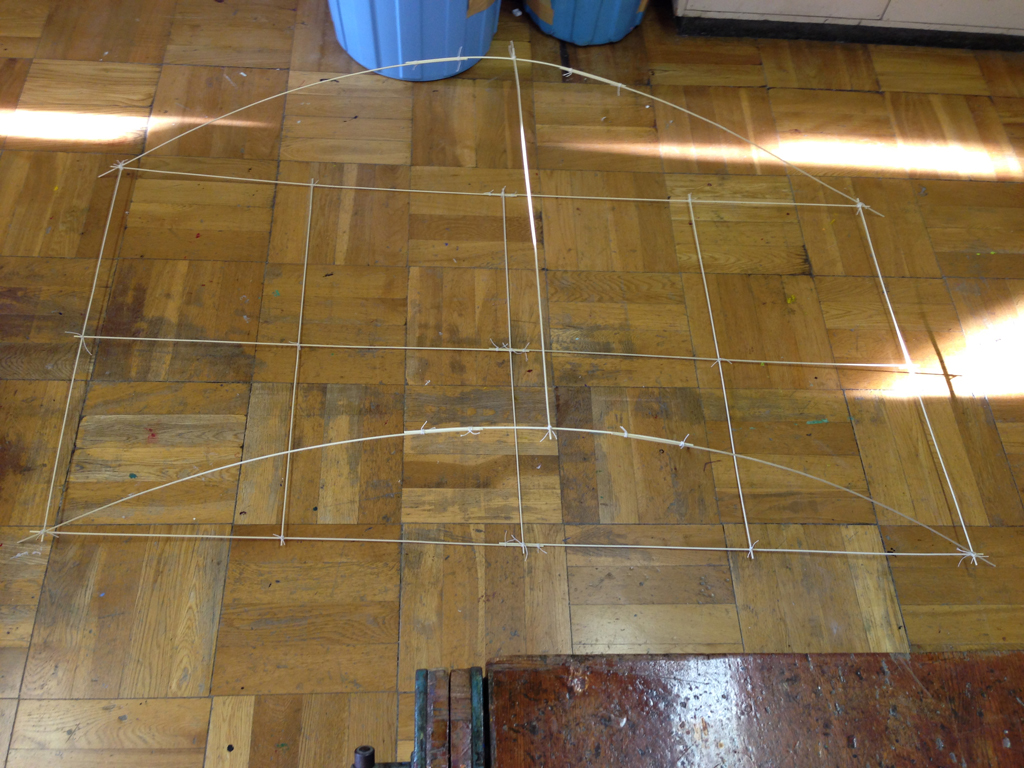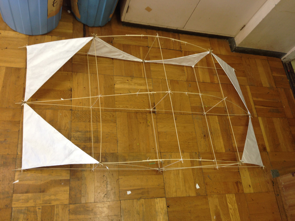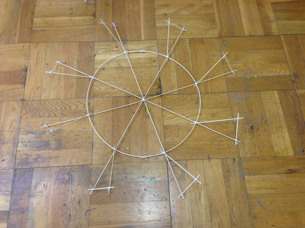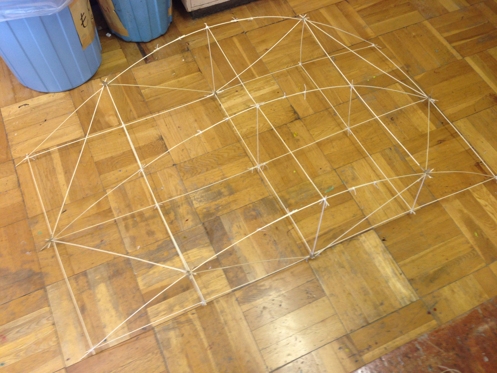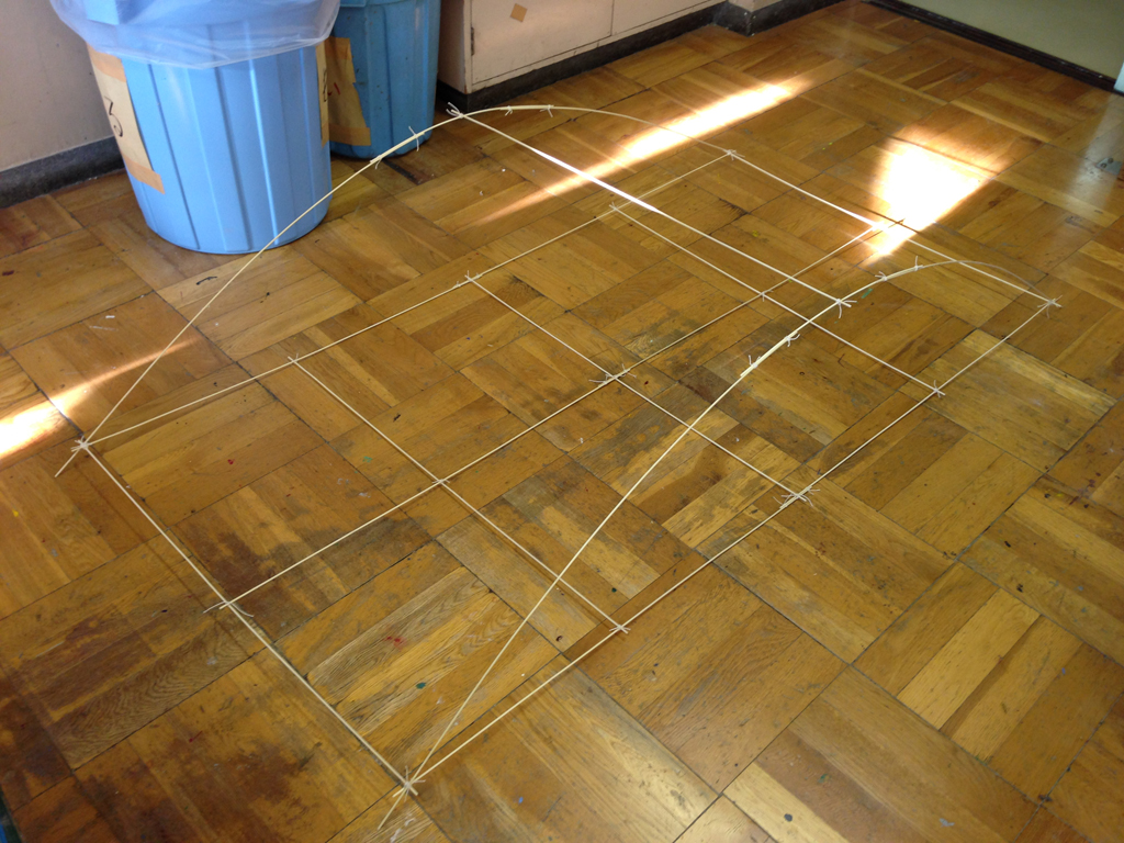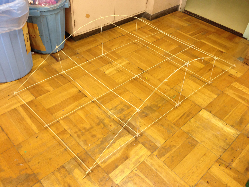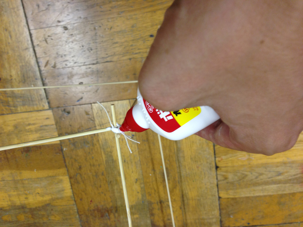 (2)たこ糸で竹ひごを固定する