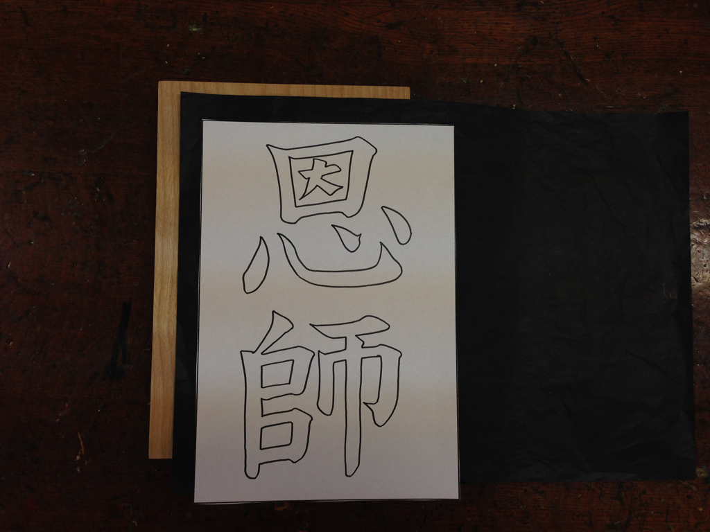 ![]() (2)下から木、カーボン紙、型紙の順に重ねる。 木の裏側には、クラスと名前を鉛筆で書く。 |