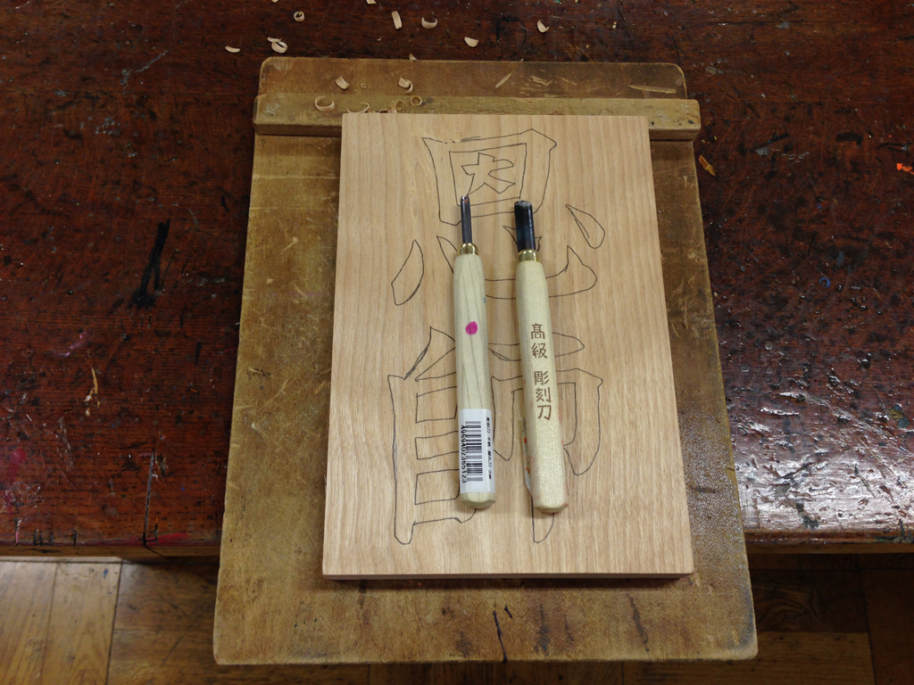 ![]() (6)印刀で文字の輪郭を彫ると、境界が深く彫れる。 |