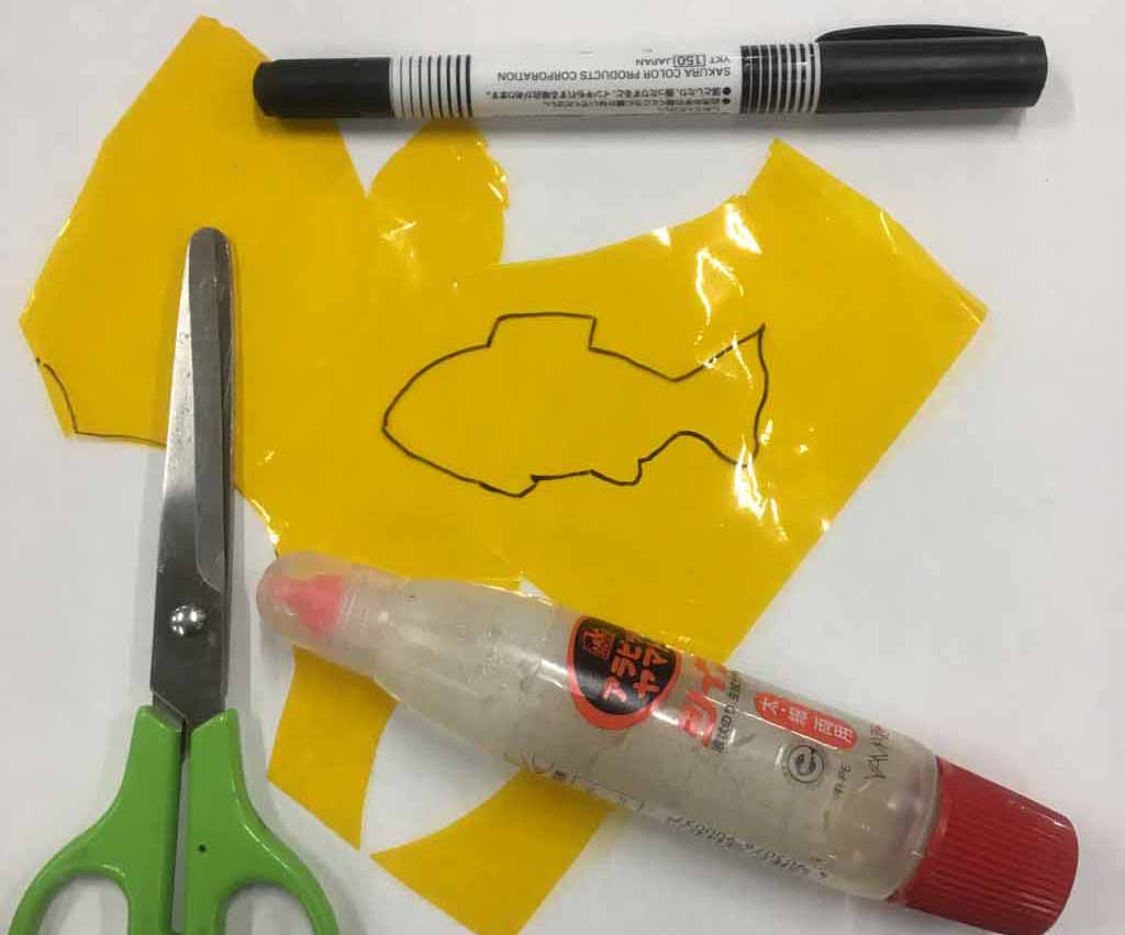 カラーセロハンは、マジックで描き、はさみで切る