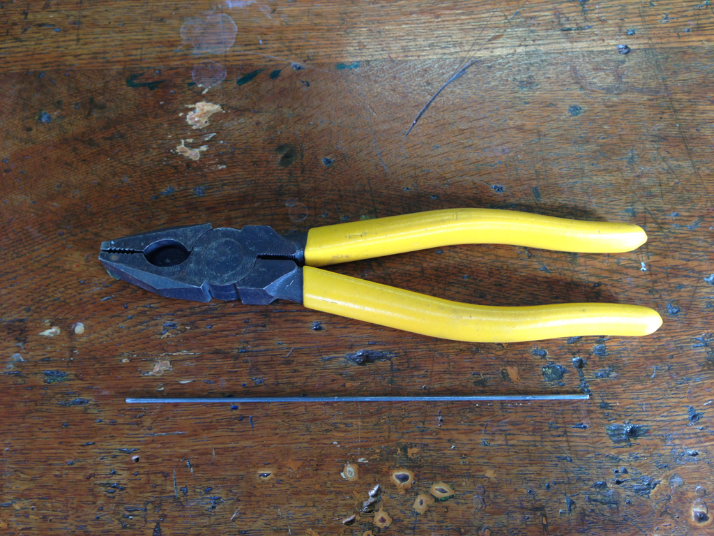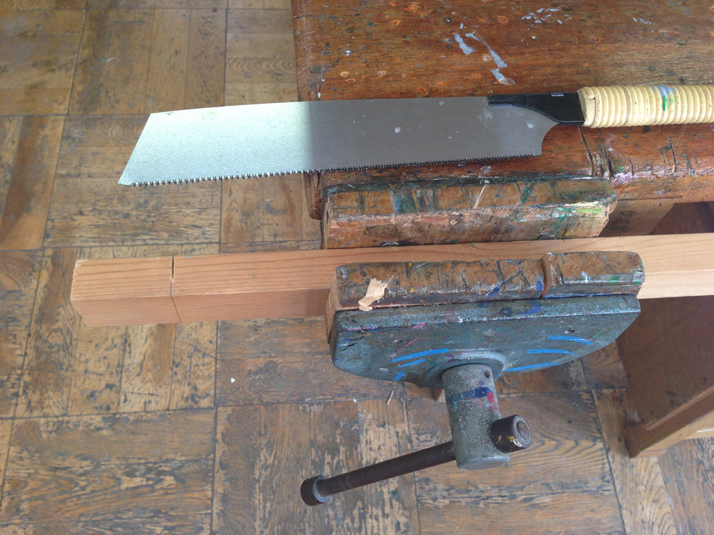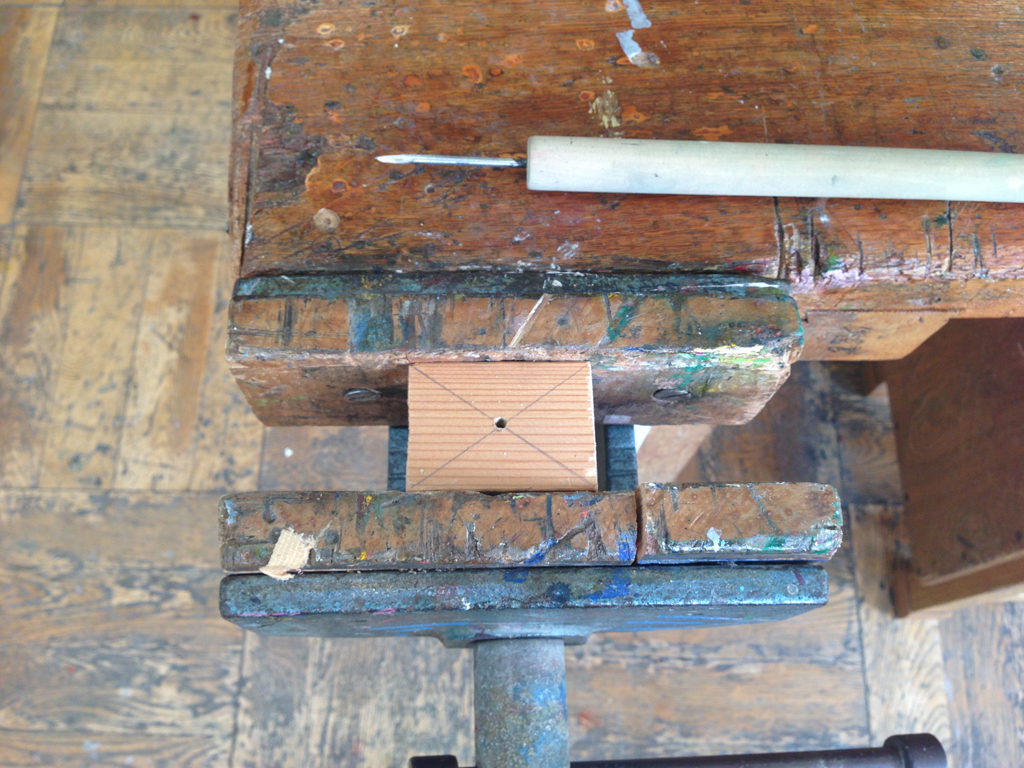 (3)万力で垂木を挟み、キリで1cmの穴を空ける。