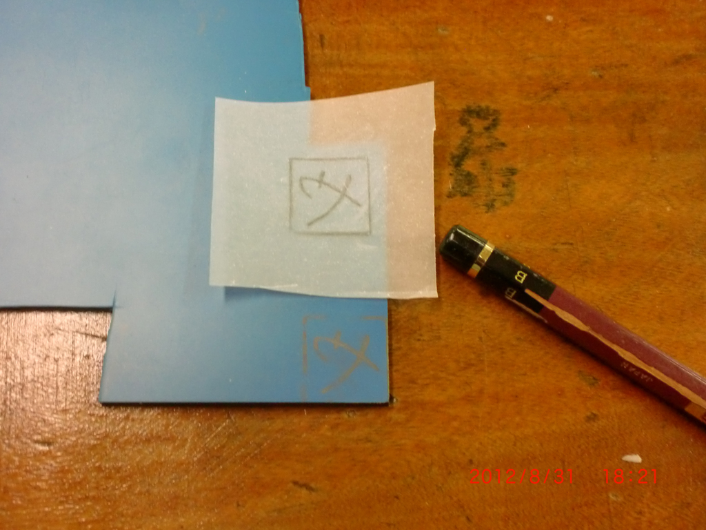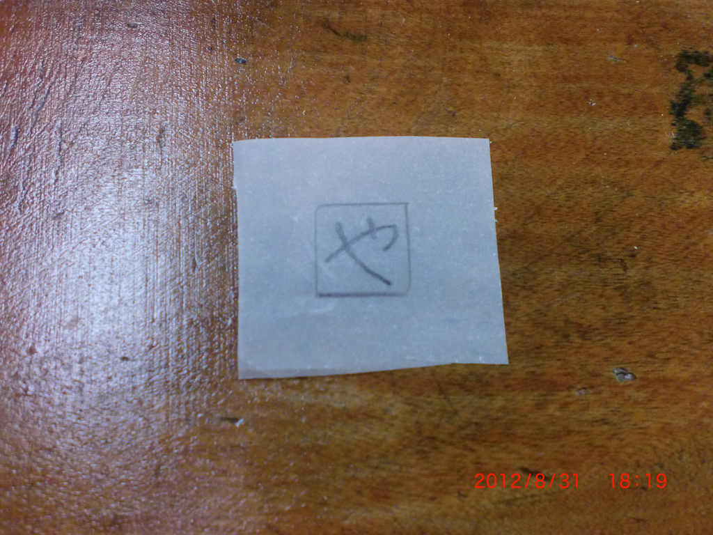 (3)ゴム版の上にデザイン画をひっくり返し、鉛筆の端などで擦って写す。