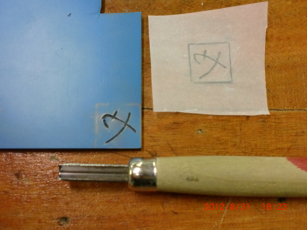 (4)ゴム版を彫刻刀で彫る。彫り上がったら、はさみとカッターで正方形の線にそって切る。